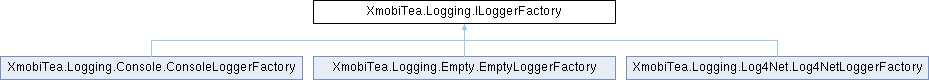 Implemented in XmobiTea.Logging.Console.ConsoleLoggerFactory, XmobiTea.Logging.Empty.EmptyLoggerFactory, and XmobiTea.Logging.Log4Net.Log4NetLoggerFactory.